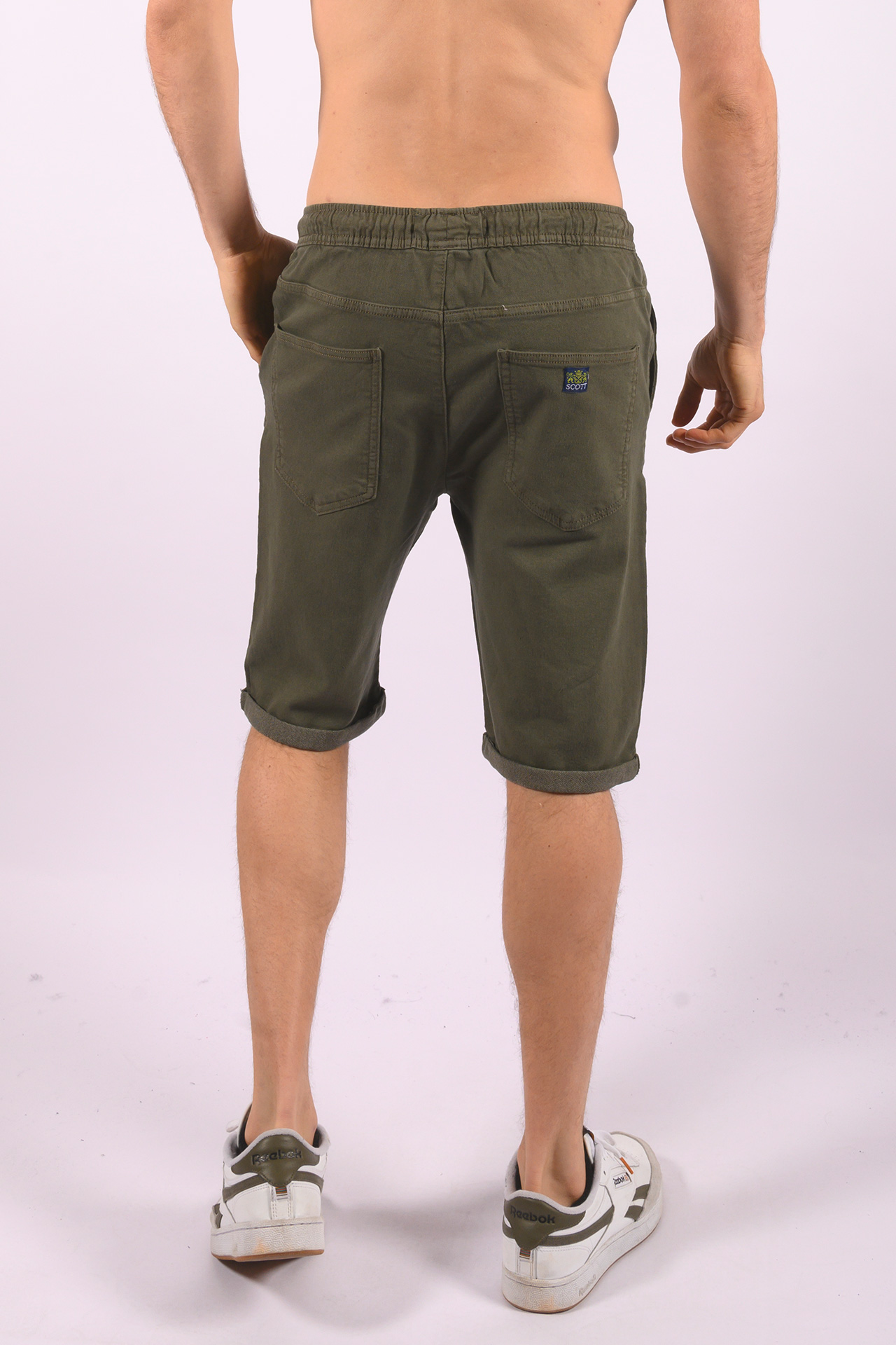 Bermuda kaki délavé stretch avec une taille élastiquée et un cordon de serrage, 2 poches devant et 2 arrière pour unir pratique et esthétique.