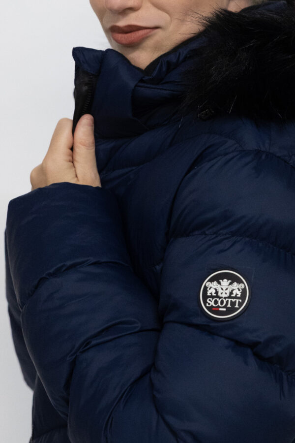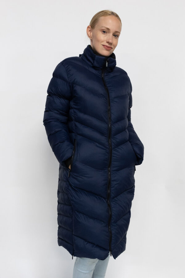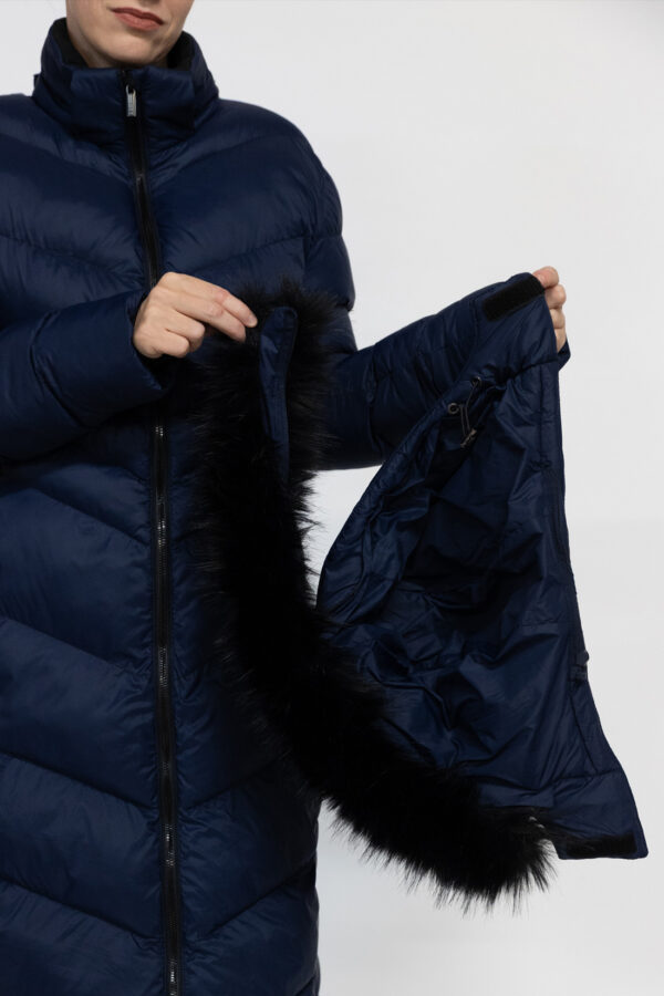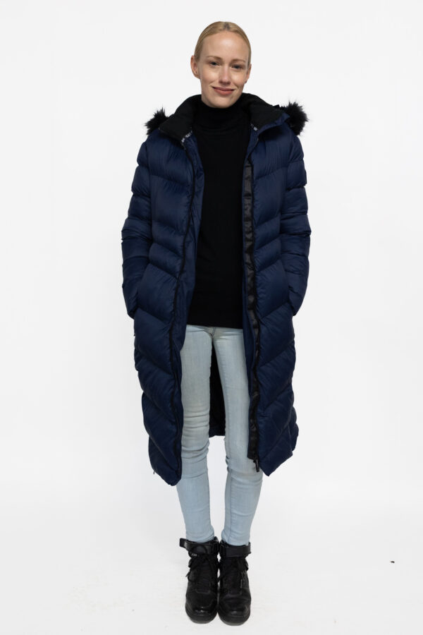Découvrez notre doudoune longue Bella de couleur marine imperméable pour femmes, une alliance parfaite entre style et fonctionnalité. Avec son col montant, son zip central étanche, ses nombreuses poches, sa capuche avec fourrure amovible, zip d’aisance sur les côtés en bas, poignets intérieurs en bord-côtes en bas des manches, col intérieur en polaire elle est conçue pour vous garder au chaud tout en restant élégante. Les poches zippées latérales et les poches intérieures offrent un espace pratique pour ranger vos essentiels. Le logo badge discret à la manche ajoute une touche de distinction à cette doudoune qui ne fait aucun compromis sur le style. Fabriquée à partir de 100% de Nylon de haute qualité, elle est prête à vous accompagner en hiver. Optez pour la polyvalence et le confort avec notre doudoune longue Dorina.