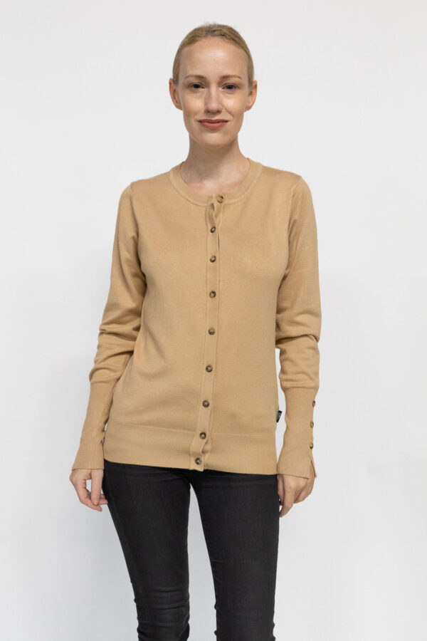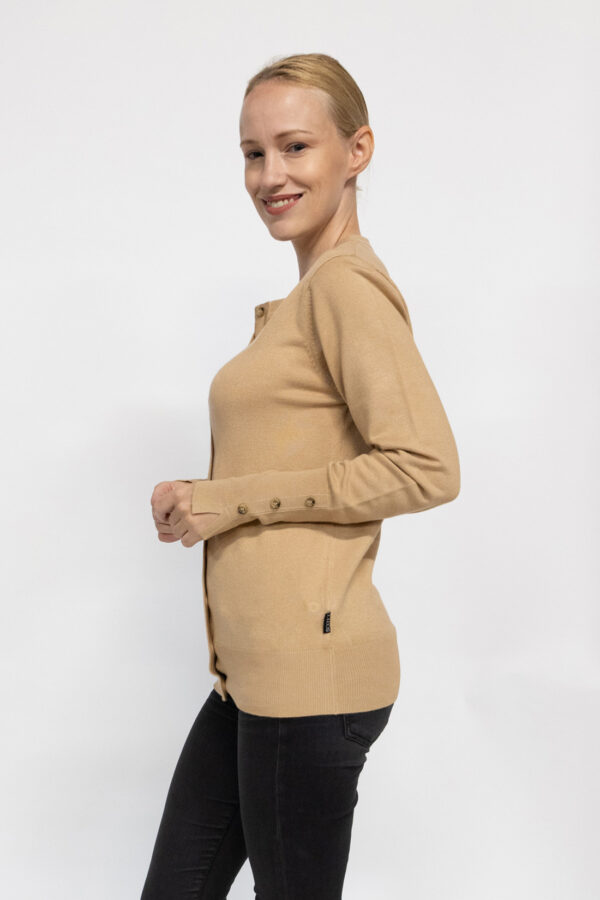 Notre gilet naturel  beige col rond boutonné offre un confort inégalé grâce à son toucher doux et agréable. Ces boutons décoratifs au niveau des manches ajoutent une touche d’élégance à ce pull polyvalent. Fabriqué avec soin à partir d’un mélange de 72% de viscose, 28% de Nylon, il est la définition même du style et du confort.