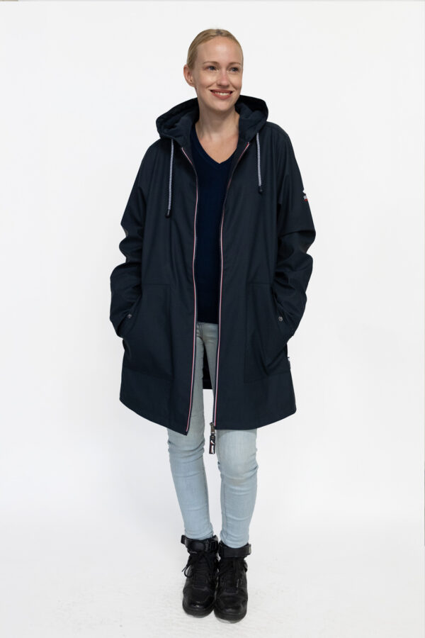 Un incontournable de toute garde-robe extérieur ,ce parka cirée marine doublée micro-polaire, intérieur entièrement doublé en micro-polaire ,Zip central apparent , capuche doublée micro-polaire avec lien de serrage , 2 poches sous rabat pression devant , 1 poche intérieure, poignets intérieurs coupe – vent en Lycra avec passe pouce , logo à la manche
