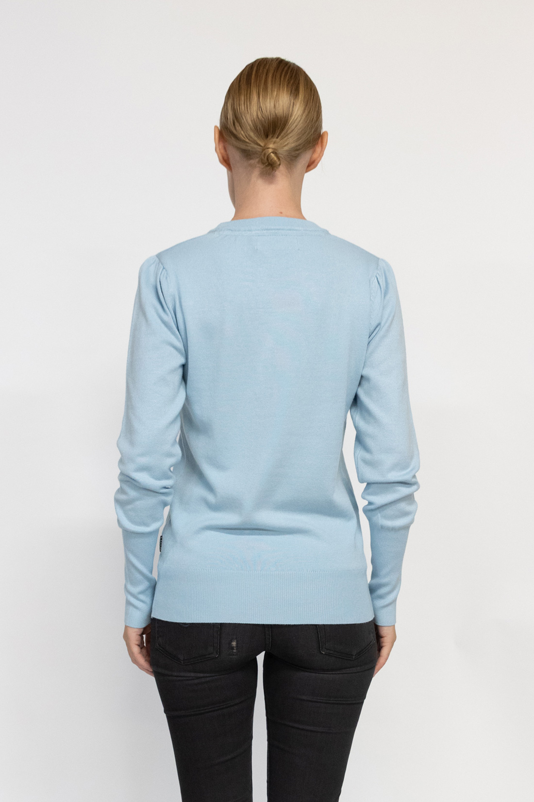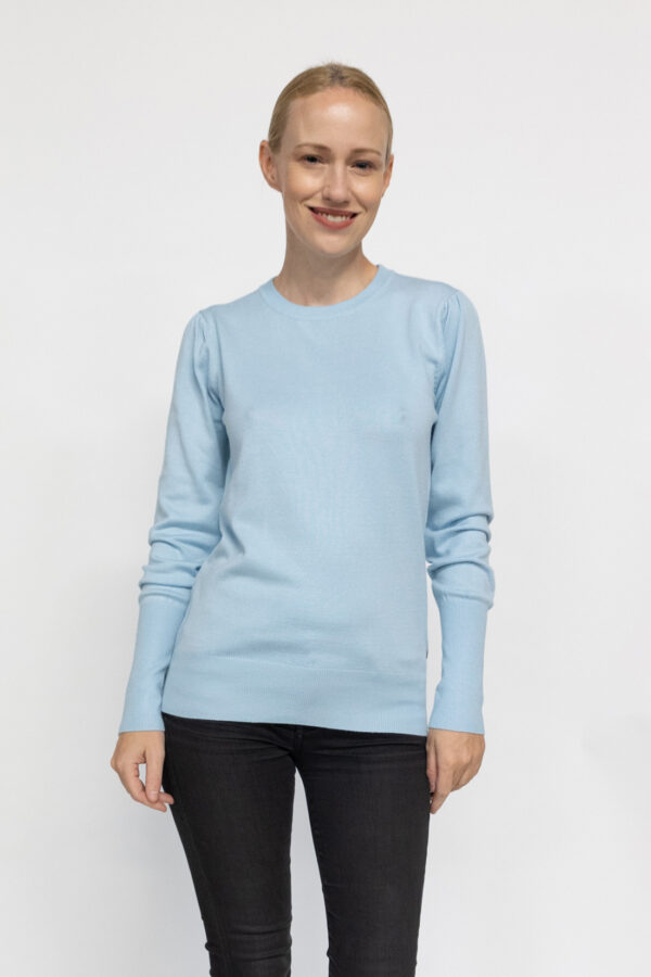 Notre pull Celine bleu ciel col rond offre un confort inégalé grâce à son toucher doux et agréable. La légère fronce au niveau des épaules  ajoute une touche d’élégance à ce pull polyvalent. Fabriqué avec soin à partir d’un mélange de 72% de viscose, 28% de Nylon, il est la définition même du style et du confort.