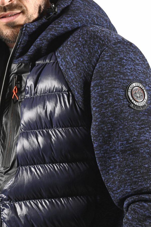 Veste zippée bimatière bleu marine matelassée avec une capuche fourrée, 3 poches devant dont une zippée à la poitrine et logo patch SCOTT au niveau de la manche et en base. Parfaite pour les jours les plus froids.