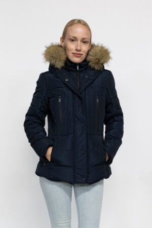 Découvrez notre doudoune longue Bella de couleur marine imperméable pour femmes, une alliance parfaite entre style et fonctionnalité. Avec son col montant, son zip central étanche, ses nombreuses poches, sa capuche avec fourrure amovible, zip d’aisance sur les côtés en bas, poignets intérieurs en bord-côtes en bas des manches, col intérieur en polaire elle est conçue pour vous garder au chaud tout en restant élégante. Les poches zippées latérales et les poches intérieures offrent un espace pratique pour ranger vos essentiels. Le logo badge discret à la manche ajoute une touche de distinction à cette doudoune qui ne fait aucun compromis sur le style. Fabriquée à partir de 100% de Nylon de haute qualité, elle est prête à vous accompagner en hiver. Optez pour la polyvalence et le confort avec notre doudoune longue Dorina.