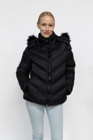 Un incontournable de toute garde-robe d’extérieur, cette doudoune courte couleur noir matelassée, tissu traité déperlant Zip central apparent, 2 poches latérales zippées devant , une poche intérieure zippée, capuche amovible par zip , fourrure synthétique amovible par zip et pression , logo sur manche