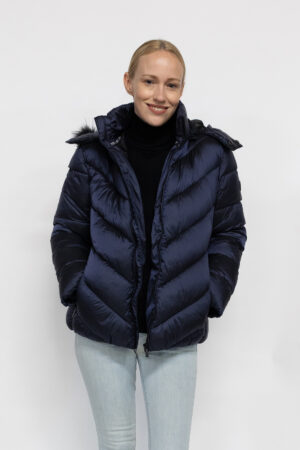 Un incontournable de toute garde-robe d’extérieur, cette doudoune courte couleur marine matelassée, tissu traité déperlant Zip central apparent, 2 poches latérales zippées devant , une poche intérieure zippée, capuche amovible par zip , fourrure synthétique amovible par zip et pression , logo sur manche